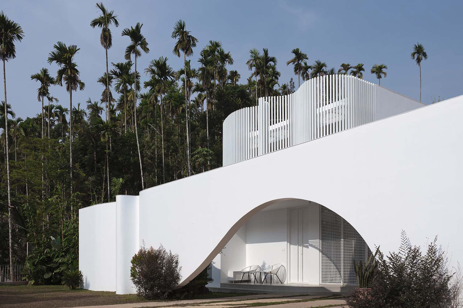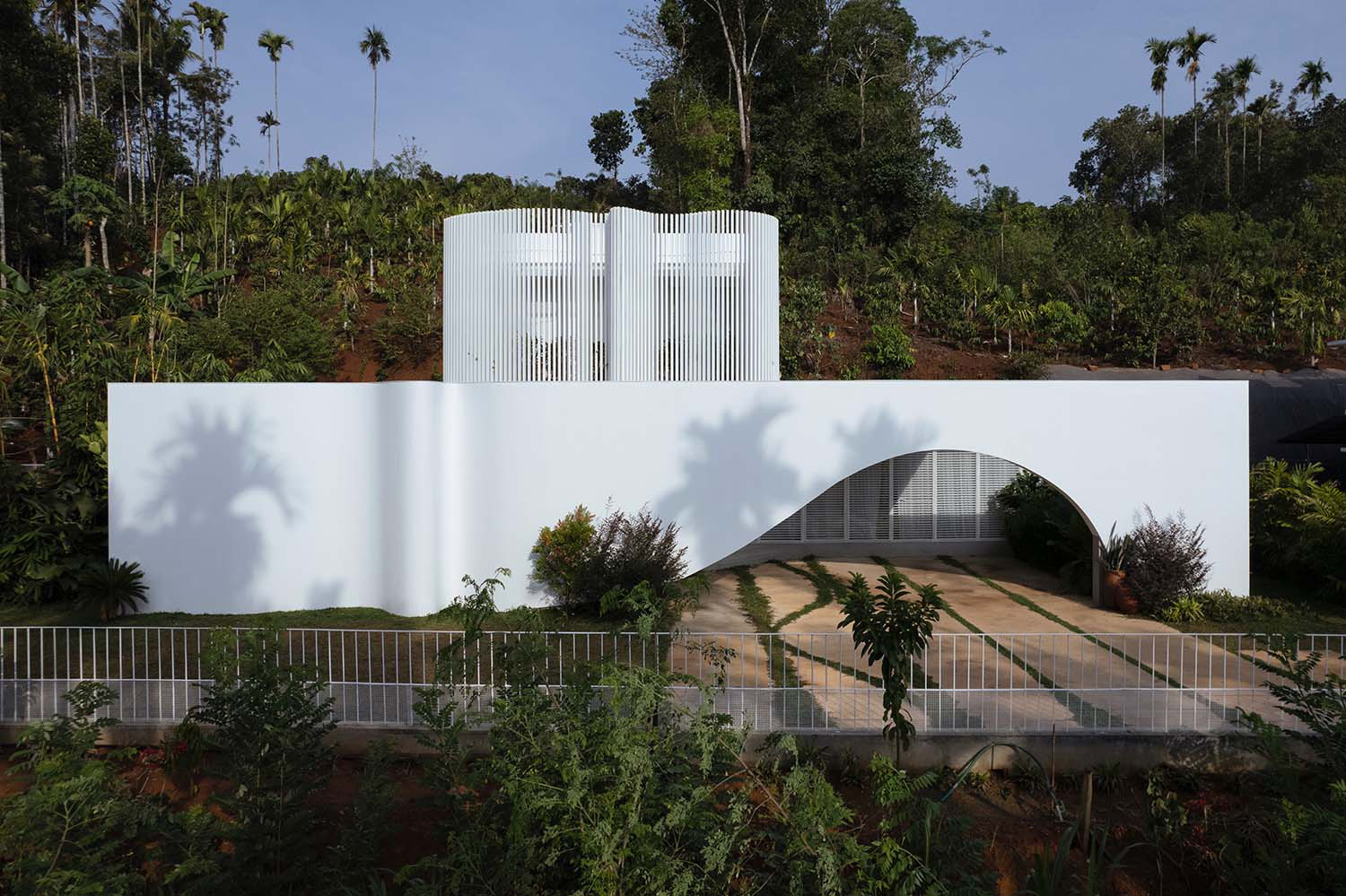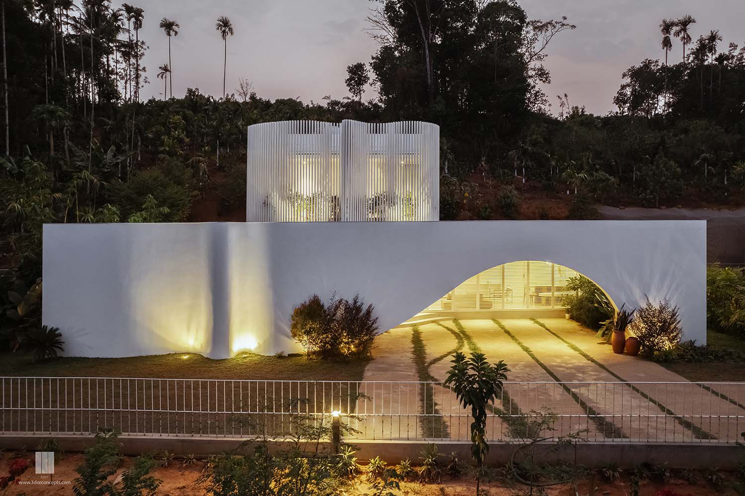 “Nyori,” a concept rooted in the Malayalam term for pleats in traditional Indian attire, embodies the graceful simplicity of nature and design. Crafted for Mr. Unais and Ms. Alisha, an IT couple seeking solace in the countryside, the house stands as a bold testament to modern minimalism. Its exterior, defined by smooth white surfaces and fluid, wave-like contours, evokes a sense of constant movement. Vertical slats filter soft light, while the lush greenery and towering palms create a sanctuary of tranquility. The interior radiates with natural light, intricate metal details, and seamless integration of private spaces, offering a serene and elevated living experience. Area: 2152 sq.ft Year: 2023 Location: Wayanad