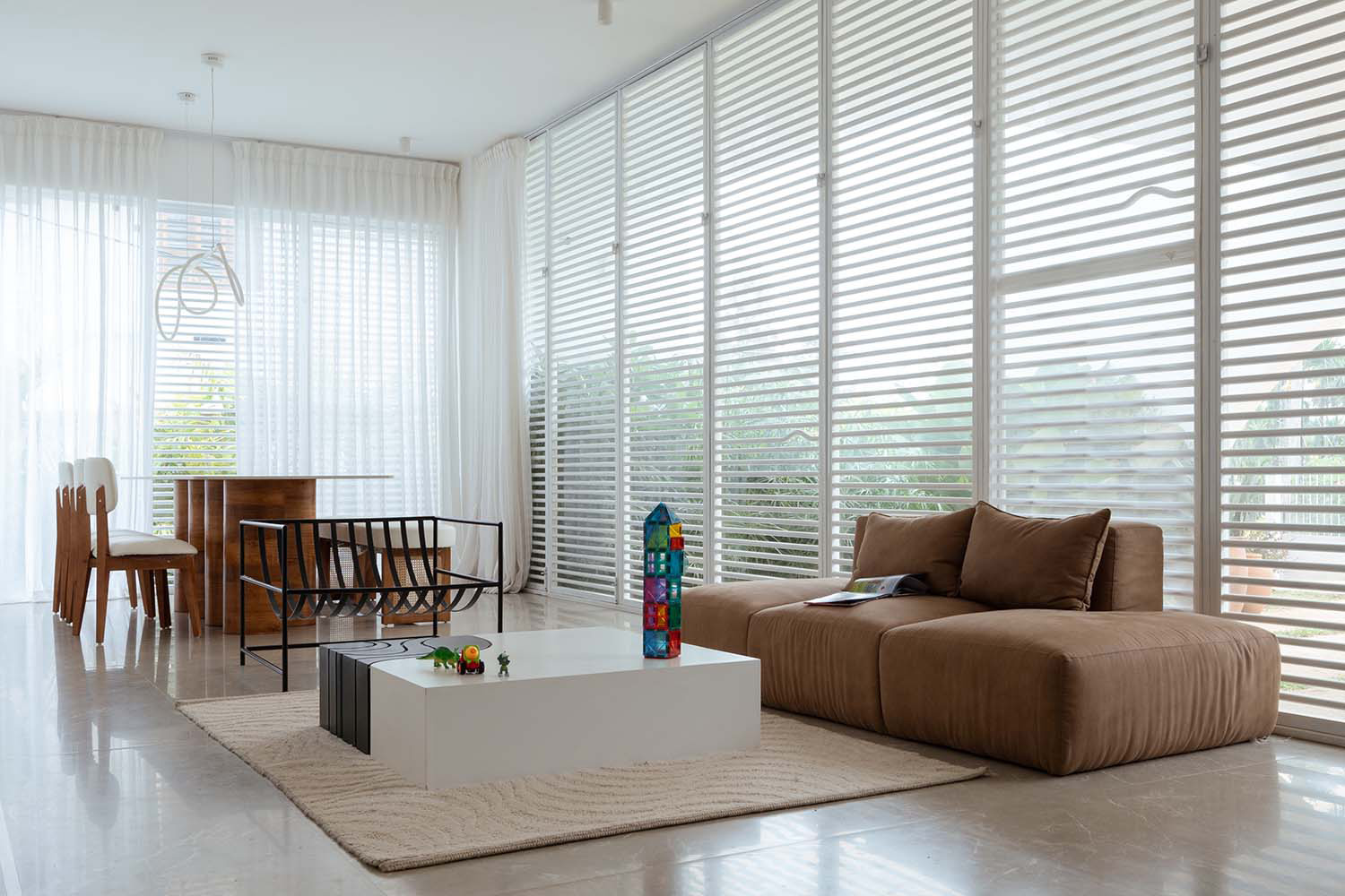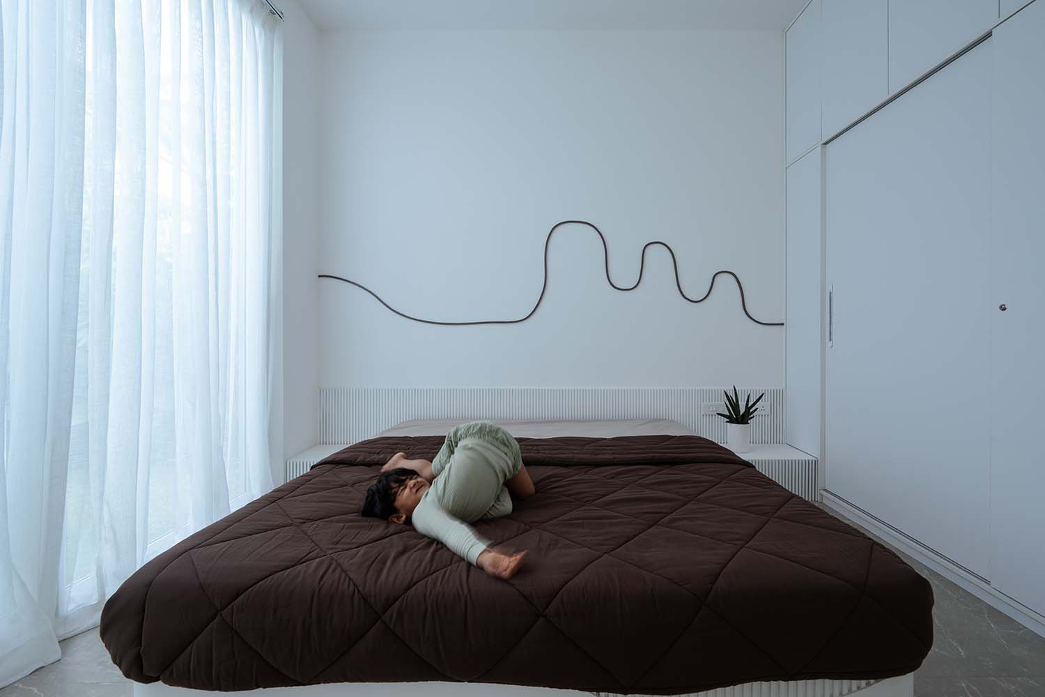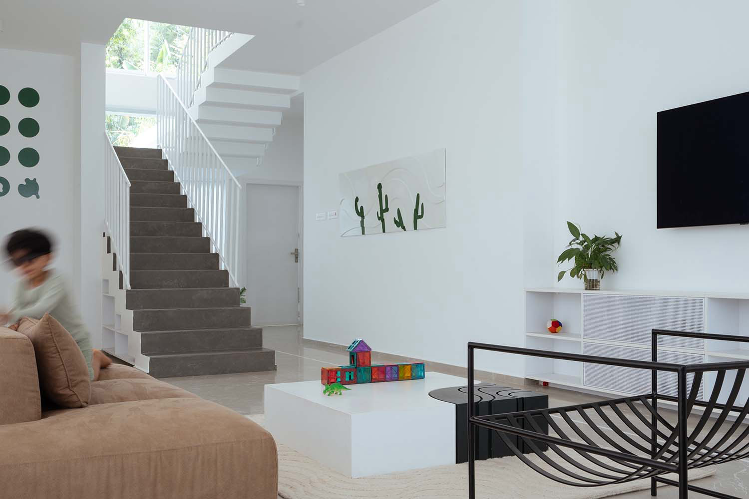 “Nyori,” a concept rooted in the Malayalam term for pleats in traditional Indian attire, embodies the graceful simplicity of nature and design. Crafted for Mr. Unais and Ms. Alisha, an IT couple seeking solace in the countryside, the house stands as a bold testament to modern minimalism. Its exterior, defined by smooth white surfaces and fluid, wave-like contours, evokes a sense of constant movement. Vertical slats filter soft light, while the lush greenery and towering palms create a sanctuary of tranquility. The interior radiates with natural light, intricate metal details, and seamless integration of private spaces, offering a serene and elevated living experience. Area: 2152 sq.ft Year: 2023 Location: Wayanad