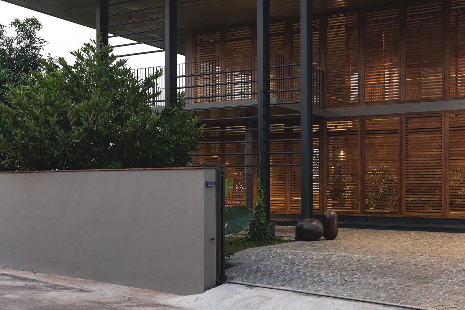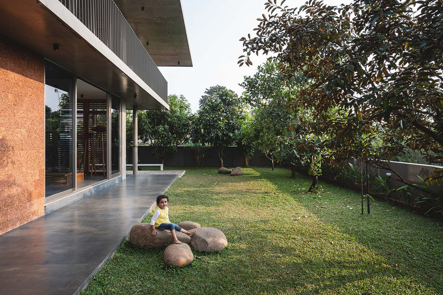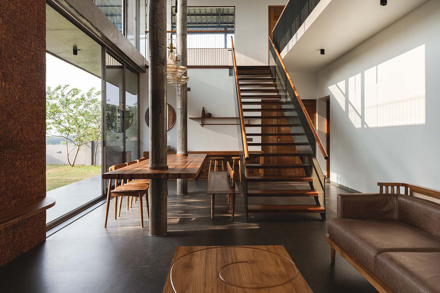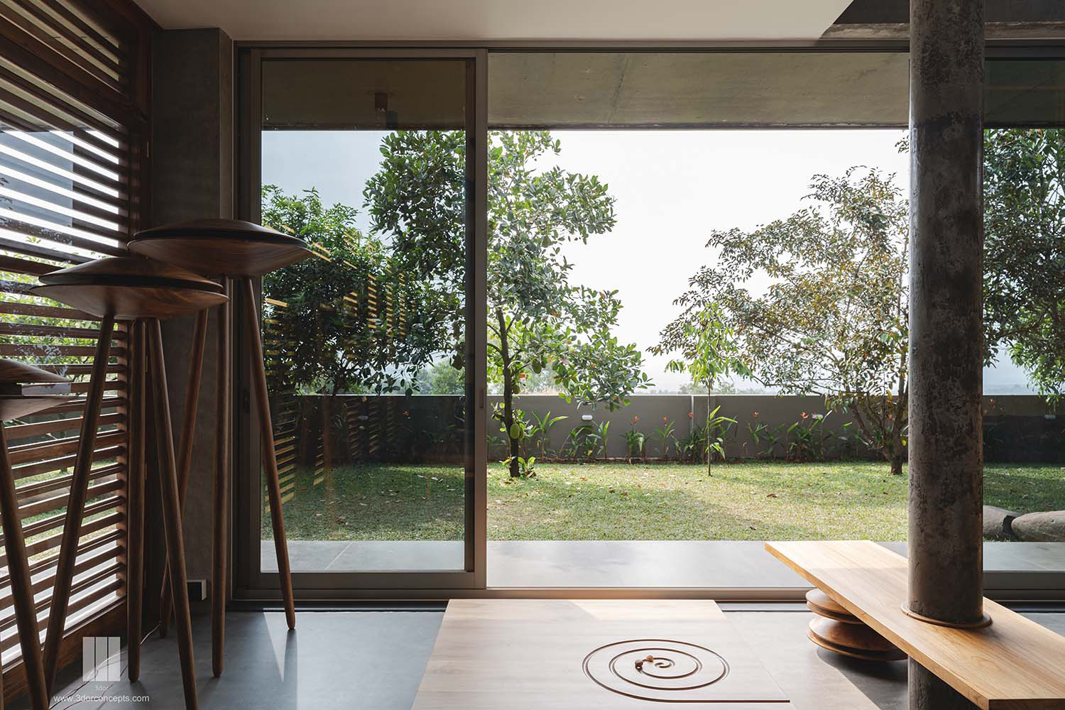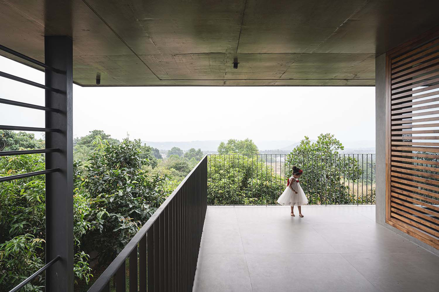 Perched atop a hill in Taliparamba, Kerala, The Slab by 3dor Concepts is a 400 m² residence designed for a family of six seeking tranquility and connection to nature. The home features a striking RCC roof slab supported by exposed I-beams, complemented by full-height wooden louvered doors that enhance cross-ventilation and shade. Strategically oriented to capture panoramic views, the two-story layout includes a double-height living and dining area, four bedrooms, and a kitchen. A cantilevered balcony doubles as a shaded porch, while laterite walls and concrete finishes blend the structure into its surroundings. Minimalist interiors feature custom furniture, including a floating dining table and a sculptural staircase, embodying a harmonious blend of form and function. Area: 4305 sq.ft Year: 2023 Location: Kannur